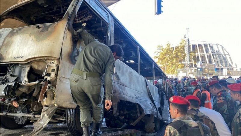 وبثت وكالة الأنباء السورية الرسمية (سانا) صورا تظهر حافلة محترقة فيما ظهر عمال إنقاذ ينتشلون أشلاء القتلى.