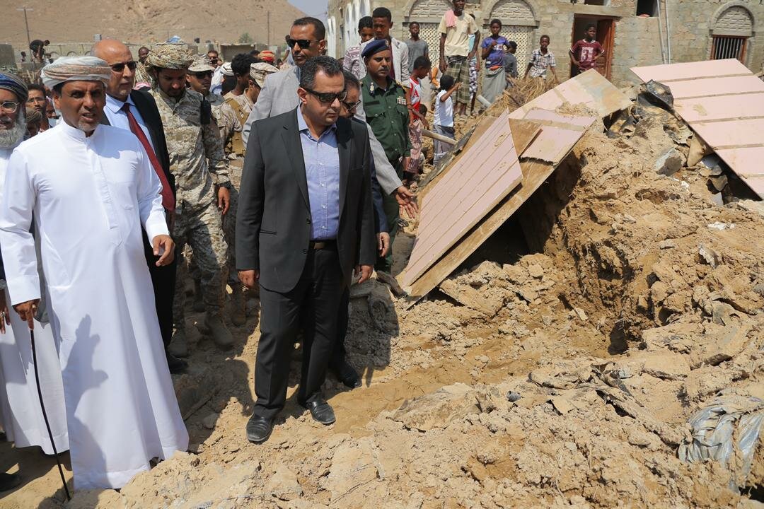 ووفقا لوكالة الأنباء اليمنية "سبأ" بنسختها التابعة للحكومة "الشرعية"، تفقد الدكتور معين، منطقة رهديد والتي تعد من أكثر المناطق تضررا من إعصار "لبان".