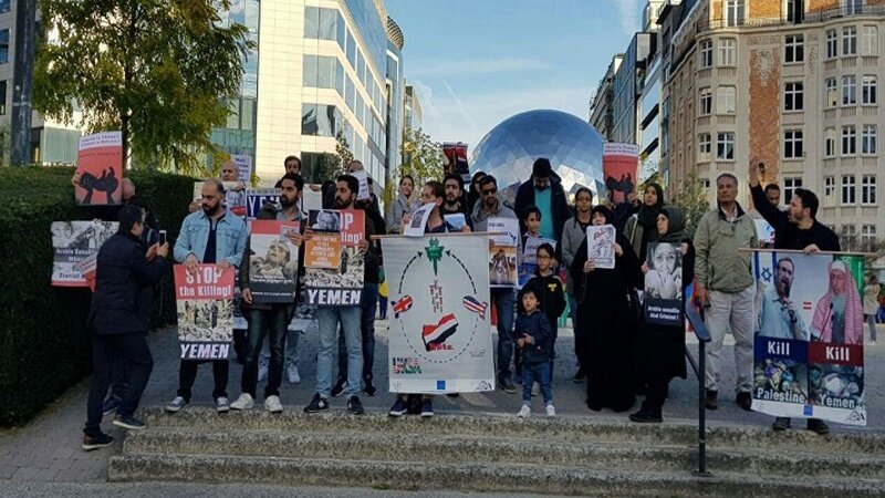 لافتات مناهضة للسعودية رفعها المشاركون في المظاهرة التي نظمها "منتدى حركة الشباب الزينبية" التركي، مطالبين بوقف الحرب في اليمن .