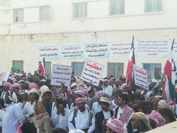 وجدد أبناء المهرة في تظاهرة حاشدة الجمعة تحت عنوان "الوفاء لدماء شهداء المهرة" مطالبهم برحيل قوات التحالف السعودي الإماراتي المتواجدة في المحافظة.