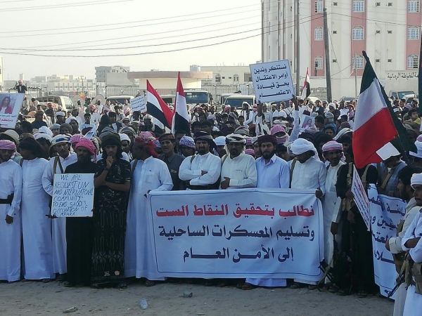 طالب محتجون من أبناء محافظة المهرة أقصى شرقي اليمن بمحاسبة المتسببين في مقتل شخصين عقب اعتصام مندد باستحداث نقاط عسكرية سعودية في منطقة الأنفاق بمديرية حصوين.