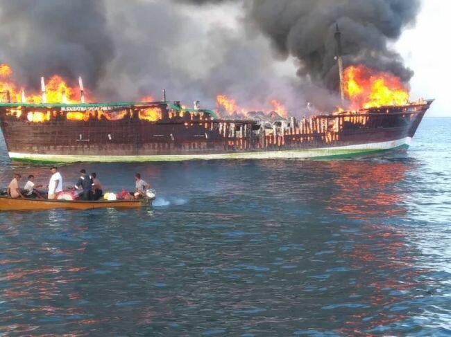 وبحسب المصادر فإن مواطنون على متن زوارق هرعوا إلى السفينة لإخمادها من النيران إلا أنهم لم يتمكنوا من إخماد الحريق نظرا لكثافته وقوته .