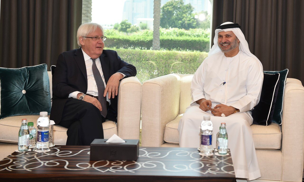 ناقش المبعوث الخاص للأمين العام للأمم المتحدة إلى اليمن مارتن غريفيث، اليوم الثلاثاء، في أبوظبي مع وزيري الدولة الإماراتيين للشؤون الخارجية الدكتور أنور قرقاش وشؤون التعاون الدولي ريم الهاشمي، جهود عملية السلام في اليمن الذي يشهد صراعاً دموياً على السلطة للعام الخامس على التوالي.