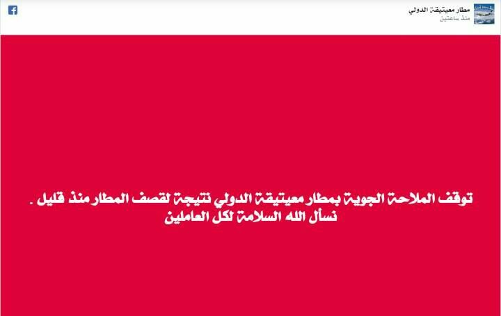 وذكرت الصفحة الرسمية لمطار معيتيقة على صفحته في "فيسبوك"، مساء اليوم، أن الملاحة الجوية في المطار توقفت نتيجة لقصف المطار. ولم توضح الصفحة، مصدر القصف، لكن متحدث باسم قوات شرق ليبيا (الجيش الوطني الليبي) أعلن أن قواته دمرت، اليوم الأربعاء، غرفة التحكم الرئيسية بالطائرات المسيرة داخل قاعدة معيتيقة الجوية في العاصمة طرابلس، دون ذكر مزيد من التفاصيل.